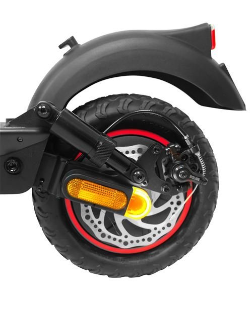 Moteur nominal : 500 W. Position du moteur : Roue arrière.Volt-Ampérage : 48V / 15Ah.Étanchéité : IPX5.Autonomie : Jusqu’à 45km.Vitesse max bridée : 25km/h.Type de pneus : Pneus crantés.Roues : 10″. Poids : 23kg.Degré de pente : Jusqu’à 18°.Suspension : Avant et arrière.Freins : Disque arrière et disque avant.Poids supporté